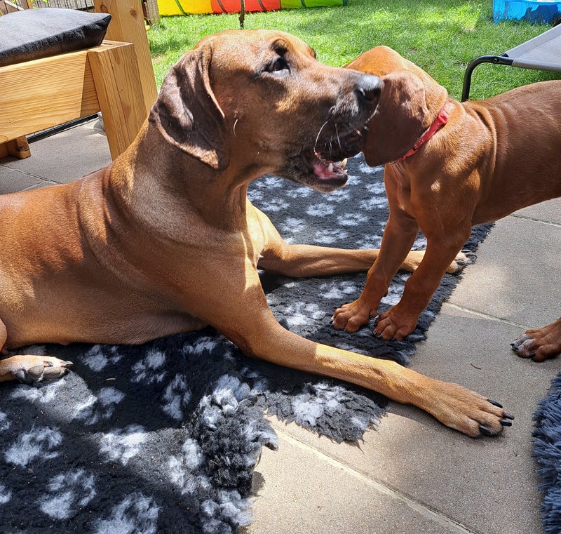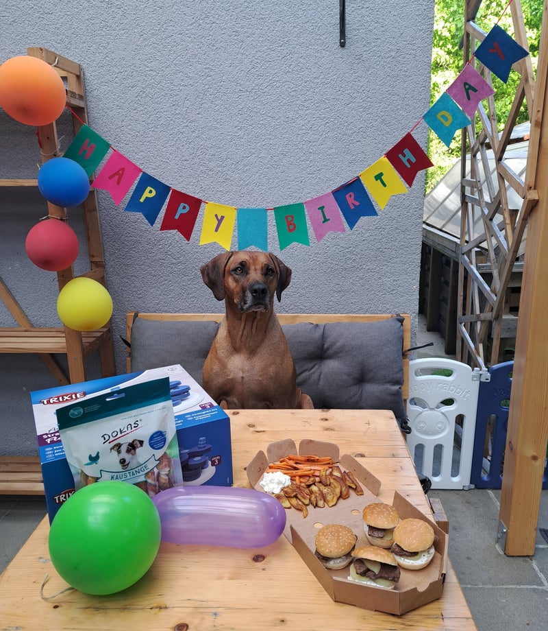 heute habe ich mit meinen Kindern und mit Herrchen und Frauchen meinen 4. Geburtstag im Garten gefeiert. Mein Herrchen hat wieder ein tolles Menü für mich zubereitet. Es gab Mini-Burger mit Rinderfilet und Harzer-Käse, gebackene Kartoffelspalten und gebackene Karottenstifte mit Frischkäsedip. Es hat super lecker geschmeckt.
