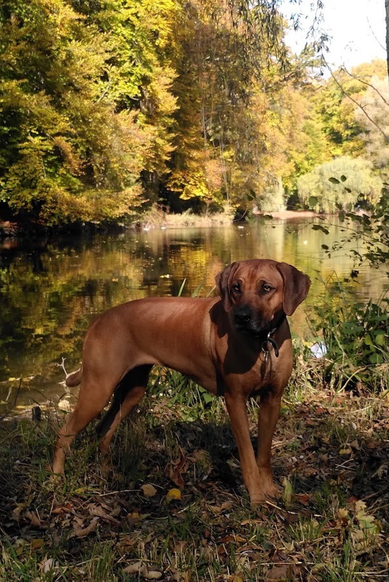 So leben wir nun zu Dritt im Westen Münchens, ruhig und im Grünen. Wir haben viel Platz in unserer Wohnung und einen kleinen, aber feinen Garten. Herrchen und Frauchen arbeiten an einer Schule, an der wir auch wohnen, das ist schon etwas besonderes. Wir sind gerne in der Natur unterwegs, lieben Wald & Wiesen, Wasser & Berge. Außerdem werkeln wir gerne. Herrchen hat für uns schon ein großes Bett gebaut, und für mich ein extra ausziehbares Bett am Bett meiner Eltern. Außerdem hat er für mich ein großes Hundebett fürs Wohnzimmer gestaltet, denn ich liege und sitze gerne erhöht. Aber eigentlich sind alle Betten und Sofas im Haus mein Eigentum. Ich bin ein richtiger Baustellenhund. Egal was gewerkelt wird, ich bin dabei und liebe Baumaschinengeräusche, ich bin Technik-interessiert. Zu meinen anderen Lieblingsgeräuschen gehören Ei aufpecken, Kühlschranktür öffnen und Napf befüllen. Frauchen backt sehr gerne. Sie macht tolle Leckerlies für mich. Ich helfe gerne in der Küche mit und muss auch schon mal den Backofen bewachen. Eigentlich esse ich alles, außer Salat und Rucola. Ich klaue schon mal gerne was. Ob es das Butterbrötchen oder der frische gebackene Kuchen ist....das habe ich wohl von meiner Mama Bibiana. Sie hat auch schon mal ein Brot mit Himbeermarmelade stibitzt. Ich bin ganz schön verfressen, so dass ich auch manchmal Fusseln aufsammle. Ich bin verschmust, aber auch wild. Zu Kindern bin ich freundlich und lieb. Fremden gegenüber bin ich erstmal skeptisch und zurückhaltend, aber wenn das Eis gebrochen ist, dürfen sie erst mal ihre Kraul-Künste unter Beweis stellen. Mit Rüden vertrage ich mich sehr gut. Mit anderen Hündinnen auch, wenn ich nicht gerade läufig werde, läufig bin oder war. Da kann ich ganz schön zickig werden und lasse mir auch die Butter nicht vom Brot nehmen. Ein wenig verrückt bin ich auch, denn ridgeback-untypisch liebe ich es zu schwimmen, und noch dazu gehe ich auch im Februar ins kalte Wasser, Diego ist mein Zeuge. Ich bin intelligent und lerne schnell. Such- und Schnüffelspiele sind mein Ding, sie bringen mir maximal Spaß und maximale Auslastung.